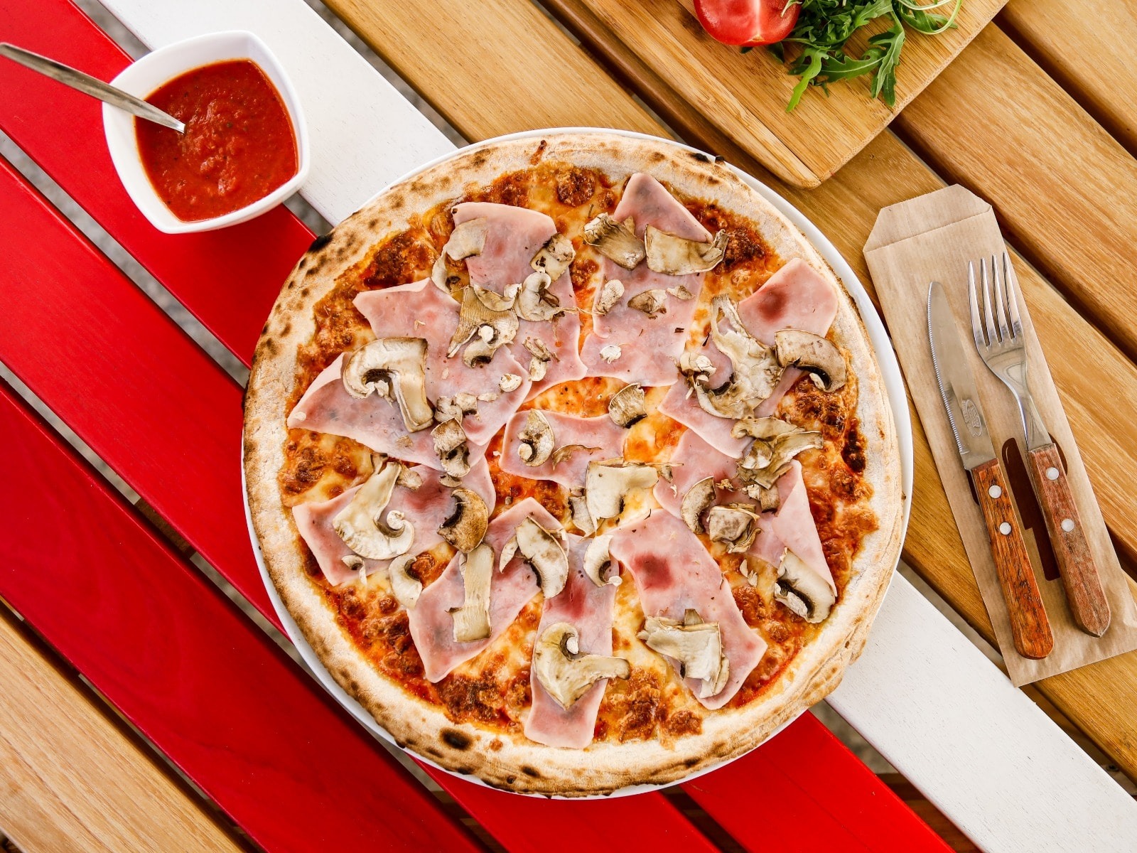 Sos de rosii, sunca, mozzarella, ciuperci