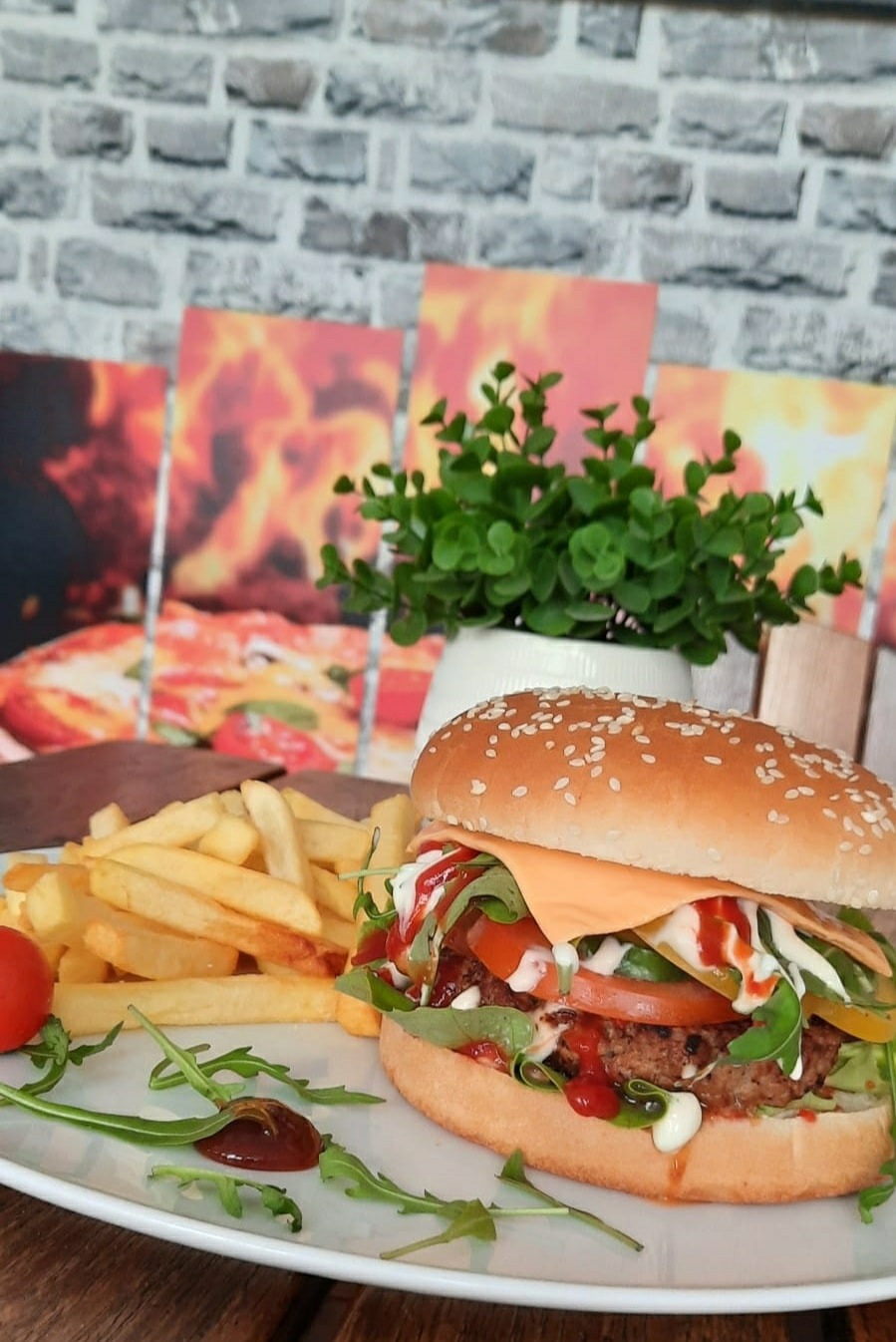 porc, vită, roșii, castraveți, ceapă, maioneză, ardei, ketchup, brânză ceddar, cartofi prăjiți, chiflă -